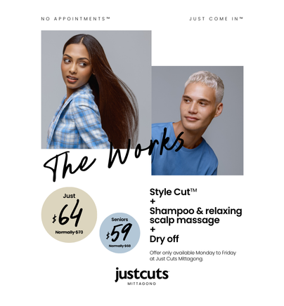 Enjoy the ultimate hair refresh with The Works package — featuring a Style Cut™, shampoo and relaxing scalp massage, plus a professional dry off. All for just $64 (normally $73) or $59 for seniors (normally $68). No appointments needed — just walk in and walk out feel amazing! Offer available Monday to Friday only at Just Cuts Mittagong, located in Highlands Marketplace.